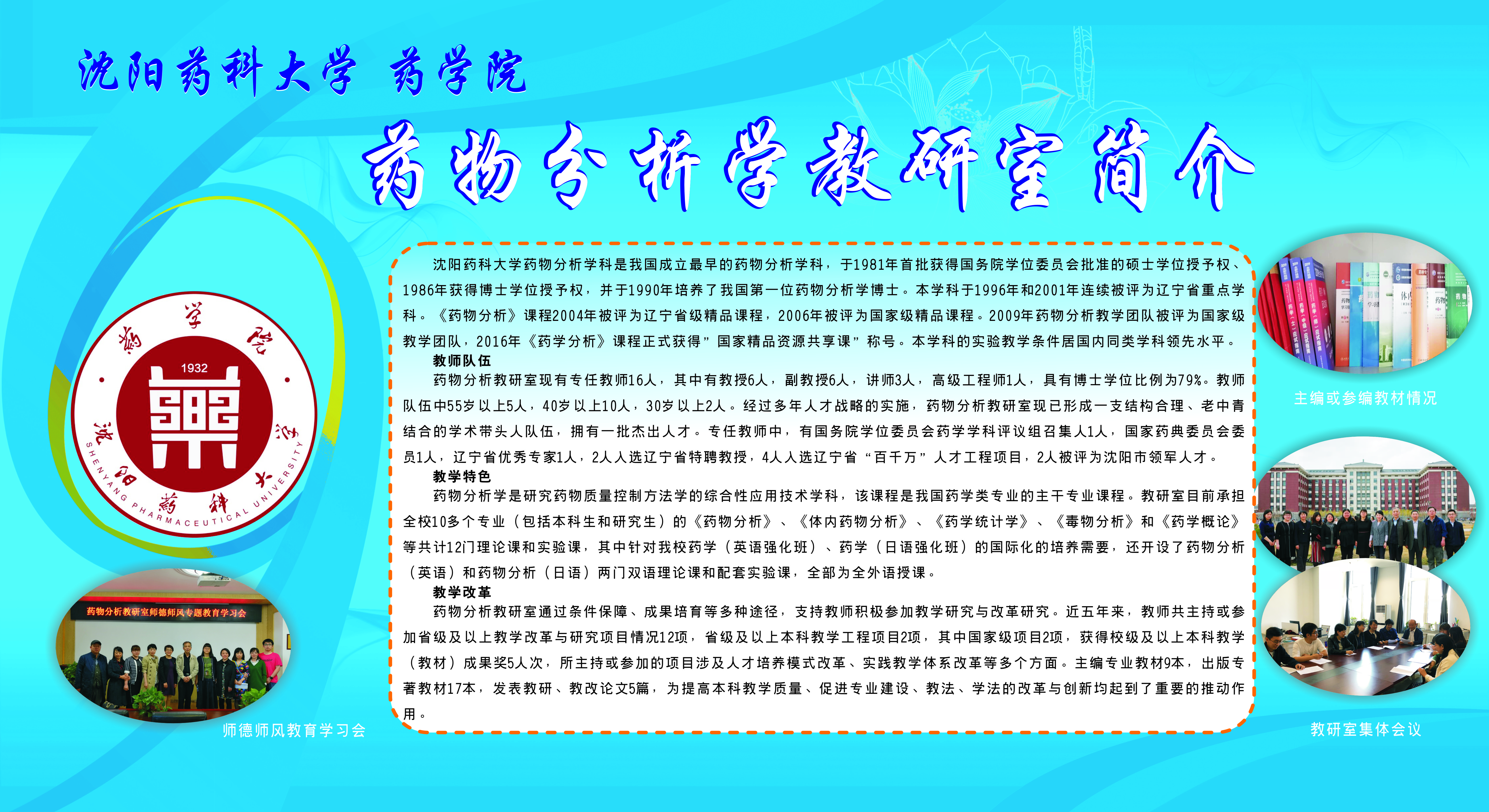 是我国最早成立的药物分析学科,分别于1984年和1986年被国务院学位委员会批准为硕士学位和博士学位授予点,培养了我国药物分析学专业的首批硕士和博士,于1996年、2001年和2007年连续被辽宁省教育厅评为辽宁省重点学科。本学科现有在职博士生导师13人,硕士生导师28人。有国家和省重点实验室4个、省级工程技术中心2个、省级分析技术服务中心1个,拥有专业实验室面积3000多平方米,具有超导核磁共振仪、液相色谱-质谱联用仪等国际先进水平的各种仪器设备。本学科的“药物分析开放实验室”是中央与地方共建高校特色实验室,主干课程“药物分析” 和“分析化学”都是国家精品课程,药物分析教学团队是国家教学团队。本学科研究生的培养目标是:培养德智体全面发展的本学科高层次专门人才,掌握药物分析学的基础理论和专门知识,了解药物分析研究的前沿与发展趋势,能应用本学科的理论、方法和技术,解决药物研发、生产和使用过程中的药品质量控制问题,能熟练地运用一至二种外国语阅读本专业的外文资料,初步具备写外文论文及进行口头报告的能力,能在高等公司、科研院所和有关药品生产和监督部门从事本专业或相关专业的教学、科研或技术管理工作。