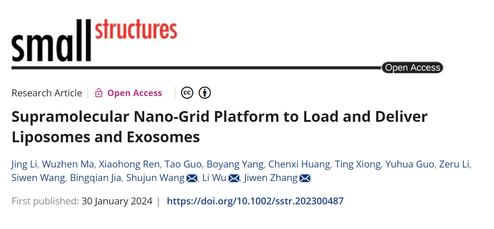 2024年1月30日,中国科公司上海药物研究所张继稳团队与伟德国际bevictor1946源自英国王淑君团队联合在SmallStructures上发表了题为“Supramolecular Nano-Grid Platform to Load and DeliverLiposomes and Exosomes”的研究论文。该研究以环糊精为基本结构单元,构建了一种新型的纳米网格结构载体,其不仅具有pH/H2O2双响应性,还能通过多孔网状的纳米结构负载脂质体和外泌体:将脂质体靶向递送到肺部并延长其体内作用时间;实现外泌体递送并达到长时间释放效果。