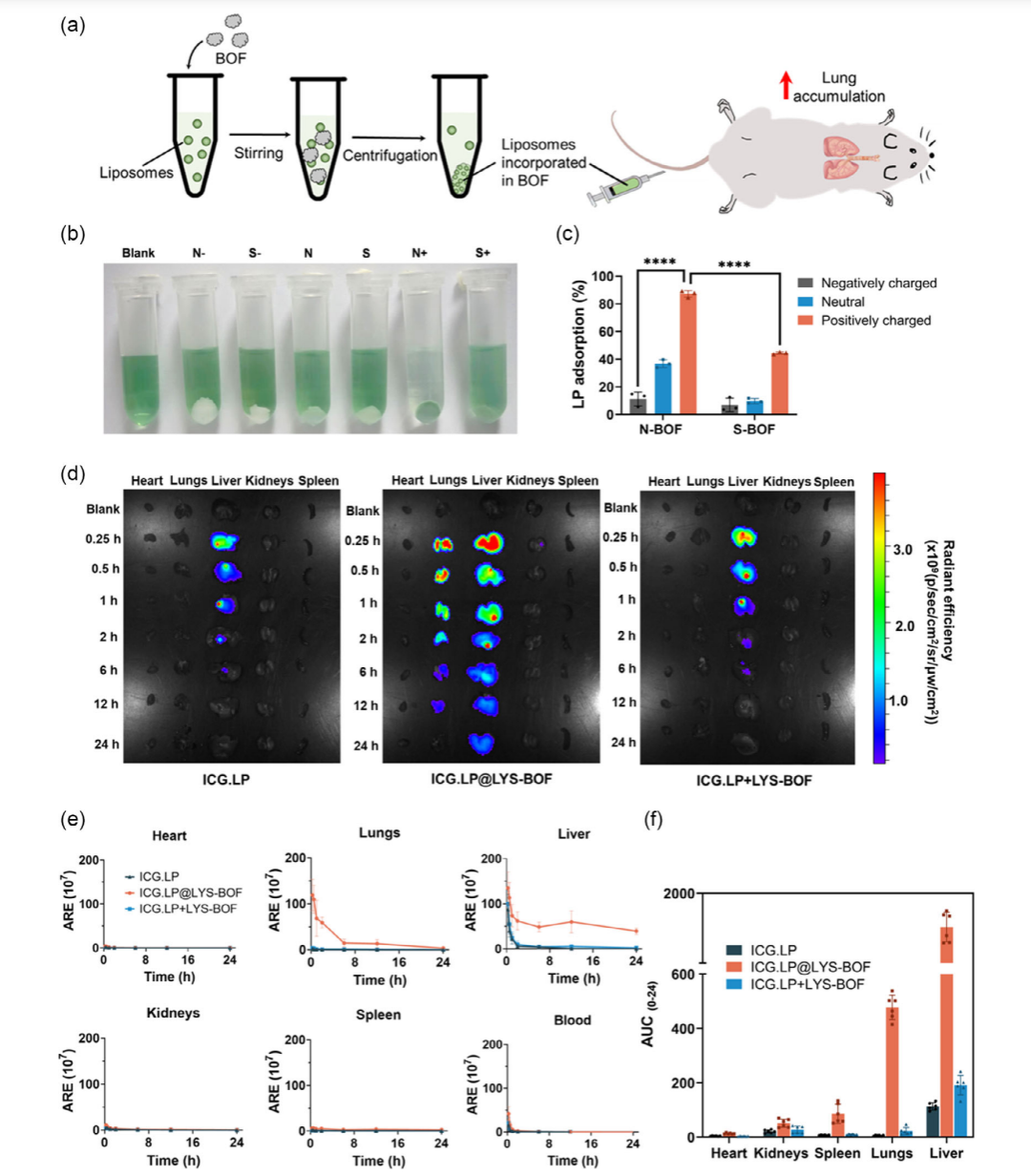 研究表明,纳米网格状结构的BOF(N-BOF)比球状BOF(S-BOF)具有更好的脂质体俘获效果,并能显著改变脂质体在小鼠体内的生物分布:游离脂质体在肺部几乎没有分布,负载于N-BOF后,脂质体在肺部的荧光信号显著增强,肺部生物利用度提高约90倍。