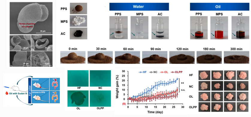 在这项研究中,研究团队利用天然花粉固有的微/纳米结构,制备了一种新型微胶囊载体。松花粉孢粉素微胶囊因其天然的核壳结构、可调湿润特性和优异的液体吸收能力,成为理想的药用微胶囊载体。通过磷酸处理天然松花粉,获得了完整、洁净且单分散的微胶囊。这种微胶囊不仅可用于液体药物的固化,还能在口服脂肪酶抑制剂后,在复杂油水体系中固化脂质,从而控制脂质吸收。这种源于松花粉的天然微胶囊载体具有药食同源的特性,并且可以实现大规模生产,使其成为肥胖源头控制药物产业化的重要候选成分。王淑君教授课题组的研究不仅为抗肥胖药物制剂的设计提供了新思路,也为天然材料的应用开辟了新途径。
