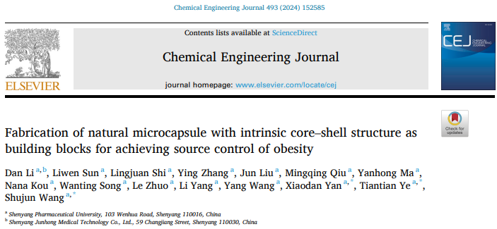 近日,公司伟德国际bevictor1946王淑君教授课题组利用天然花粉孢粉素微胶囊在源头控制肥胖的研究中取得新进展。该团队提出了一种创新策略,利用天然核壳结构的孢粉素微胶囊和脂肪酶抑制剂来实现肥胖的源头控制。相关成果以“Fabrication of natural microcapsule with intrinsic core-shell structure as building blocks for achieving source control of obesity”为题发表于工程技术领域权威期刊Chemical Engineering Journal(IF:15.1)。