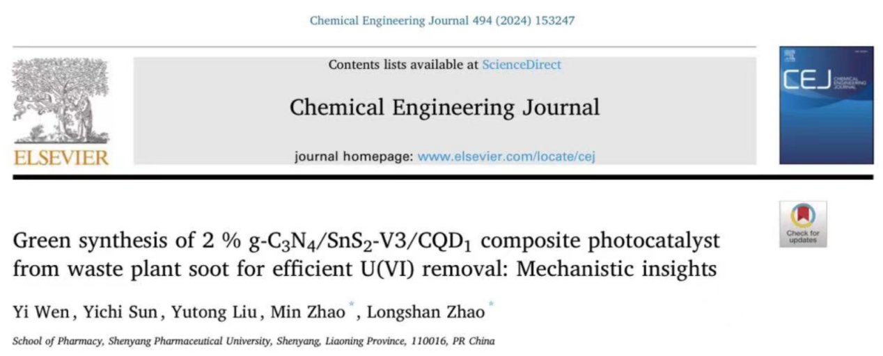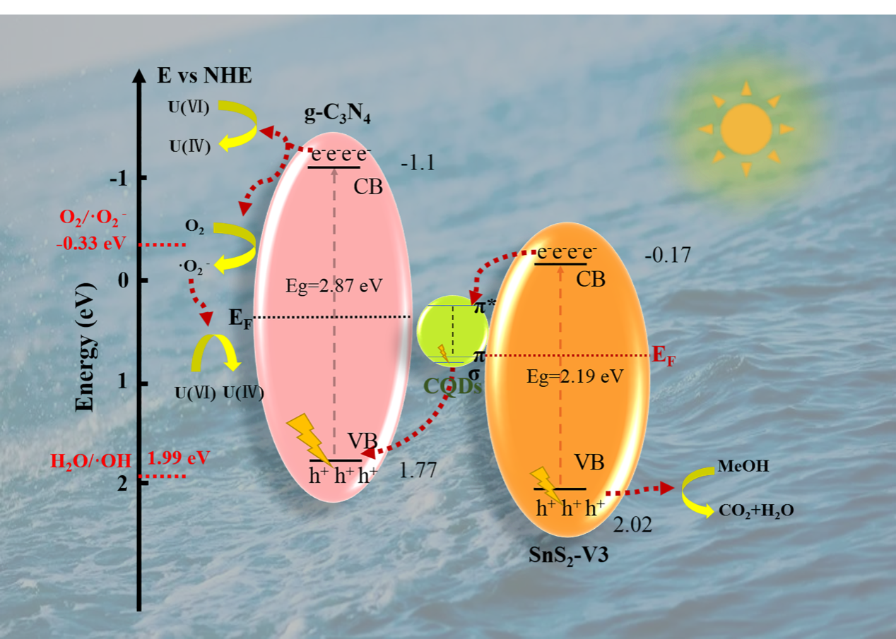 近日,伟德国际bevictor1946源自英国赵龙山教授和赵旻副教授课题组基于中药百草霜成功设计和构建了Z型2% g-C3N4/SnS2-V3/CQD1光催化体系,实现了U(VI)的光催化去除,该体系表现出高效的去除能力、高效的自然可见光收集能力和良好的上转换性能。以硝酸铀酰六水合物(N2O8U·6H2O)作为放射性元素U(VI)污染物模拟物,通过配比优化评价合成的复合纳米光催化剂的光催化性能,并深入探究了光催化活性增强的机理。这项工作不仅为其他多功能复合光催化剂的构建提供了思路和策略,而且还为解决放射性元素污染提供了一种新方法。相关成果“Green Synthesis of 2% g-C3N4/SnS2-V3/CQD1 composite photocatalyst from waste plant soot for efficient U(VI) removal: Mechanistic insights”发表于国际化学权威期刊Chemical Engineering Journal(IF:13.3,中科院一区,DOI: 10.1016/j.cej.2024.153247)。