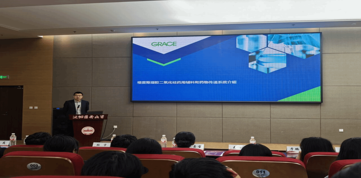 颁奖仪式后,格雷斯公司薛芃经理作了精彩的学术报告,详细介绍了格雷斯各类药用二氧化硅的特性与应用,重点讲解凝胶二氧化硅药用辅料和药物传递系统,为在场师生带来了一场学术盛宴。获奖两个课题组的员工代表,2022级药剂研究生程东明做了题为《以介孔二氧化硅为载体改善穿心莲内酯的溶出度与口服吸收》的学术汇报,2023级研究生刘颖作了题为《介孔硅载体构建药物包埋固体分散体》的学术汇报。在学术报告后的答疑环节,师生以及企业代表互相交流,详细介绍了他们在实验过程中运用格雷斯产品攻克技术难点的实际案例,与会师生进行了思想的碰撞,产生了灵感的火花。“格雷斯奖学金”的设立,是加快推进校企协同发展、深化产教融合的重要举措,有利于培养具有高度社会责任感的应用型人才,更好的促进公司教育事业发展。“格雷斯奖学金”不仅是物质上的奖励,更是精神上的激励与鼓舞,彰显了格雷斯贸易有限公司对教育事业的重视和对青年一代的期望。本次颁奖仪式在浓厚的学术氛围中圆满落幕,不仅展现校企合作的丰硕成果,更开启双方协同创新、共谋发展的新篇章。