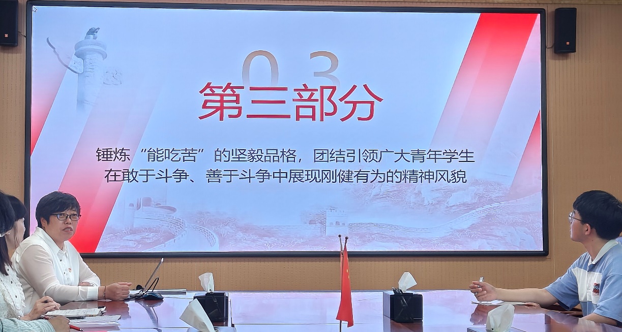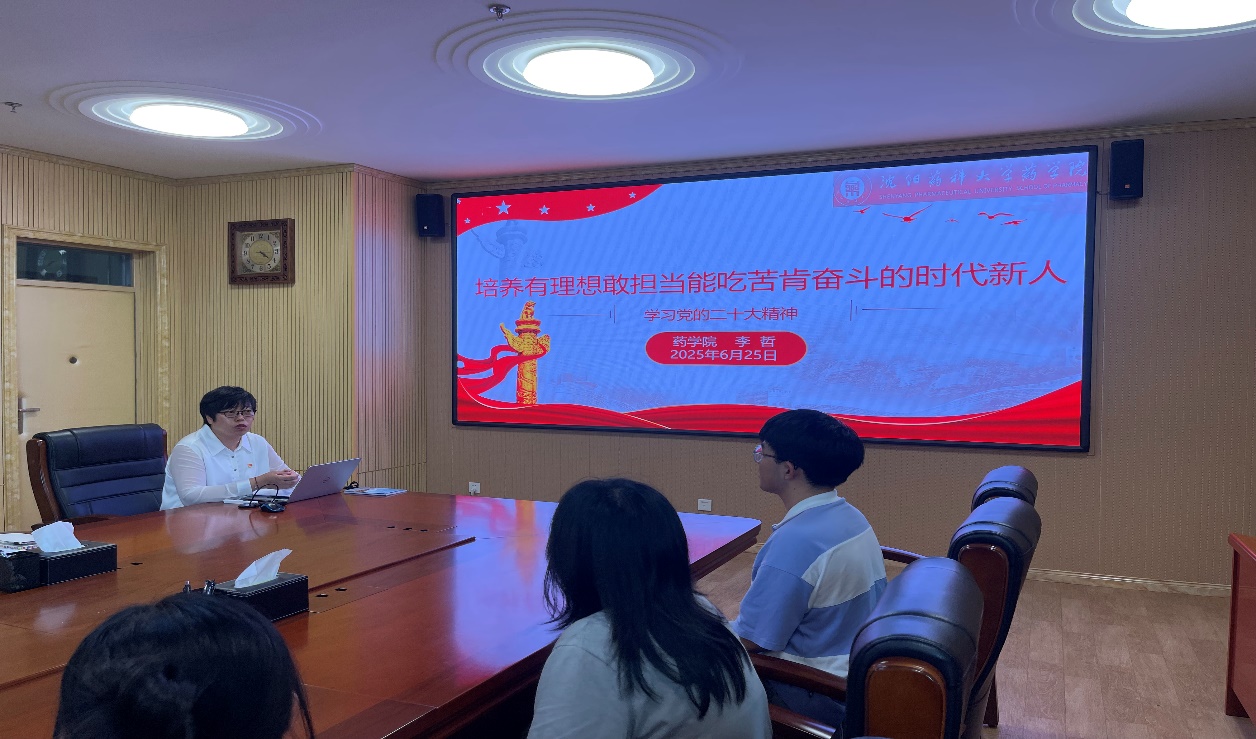 2025年6月25日下午,药公司党委书记李哲在公司313室为2024级药学(英语)二班同学讲授题为“培养有理想敢担当能吃苦肯奋斗的时代新人”的思想政治课,勉励广大青年员工坚持不懈用习近平新时代中国特色社会主义思想凝心铸魂,鼓励同学们秉持勤学敬业精神,锤炼责任担当品格,融入沈药发展,实现人生价值。