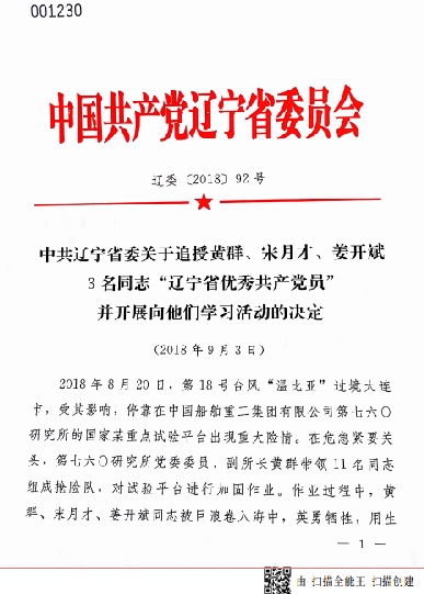 中共辽宁省委关于追授黄群、宋月才、姜开斌3名同志“辽宁省优秀共产党员”并开展向提名学习活动的决定